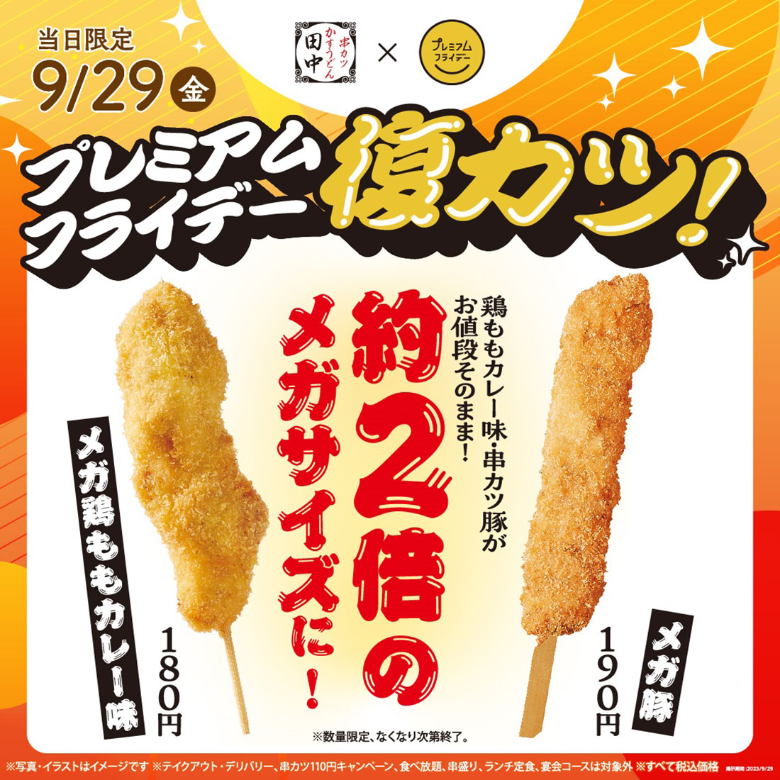 9月29日(金)限定!串カツ田中といったらメガ串!お子様に人気の「鶏ももカレー味」と人気No.1串の「串カツ豚」を、お値段そのままに約2倍のメガサイズで提供!!