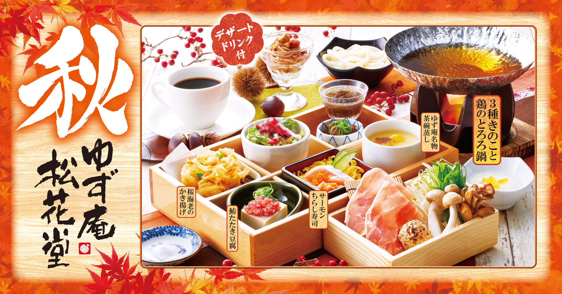 平日ランチタイム限定の「ゆず庵松花堂」が、秋の献立で登場。デザート・ドリンク付きのセットは、秋期間限定のデザート3種からもお選びいただけます。