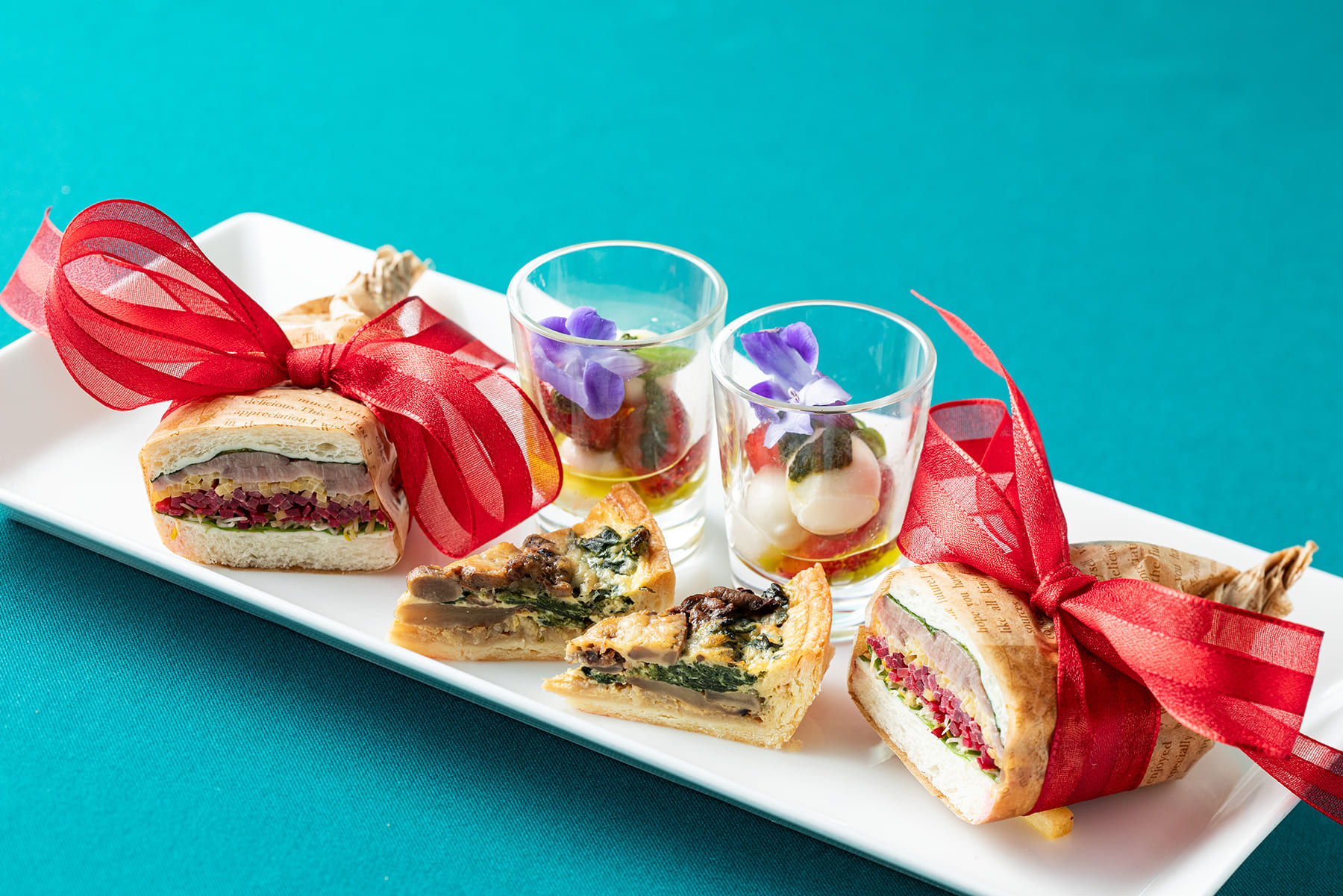 上段には、柚子クリームのホワイトツリーやツリーに飾るオーナメントのようなフォルムのホワイトチョコレートのムース、リースに見立てたメレンゲが登場。中段には、この時季ならではのクリスマスカラーの野菜入りローストビーフのラップサンド、苺とモッツアレラチーズのカプレーゼなど華やかなセイボリーが並びます。