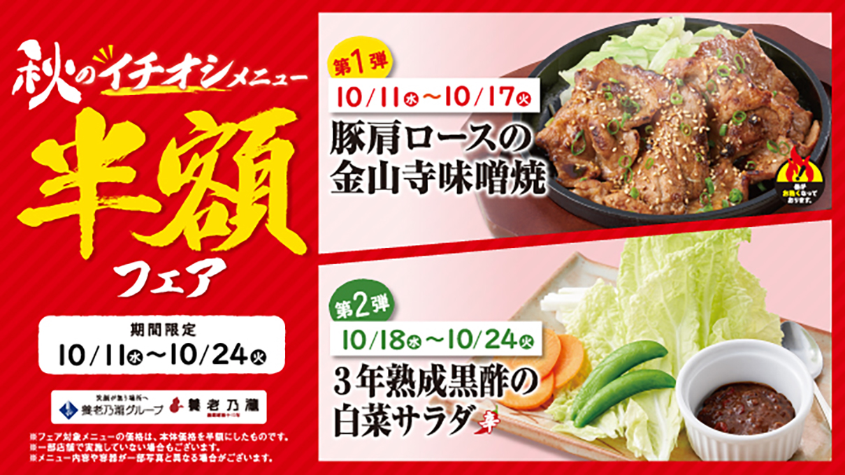 美味しさに磨きをかけたメニューが登場!養老乃瀧『秋のイチオシメニュー半額フェア』開催