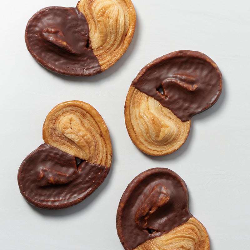 バターで生地を包んで折り込んでいく、アンベルセ製法で仕込んだサクサクのパイ生地に、ミルクチョコレートを合わせたお菓子です。