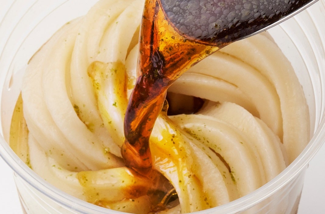 ぶっかけだしに青じその風味を効かせ、さっぱりとした味わいに。ほどよい酸味の紀州梅だれとまろやかなバターソースを隠し味に、香りとコクを最大限に引き立たせています。すする度に麺のもちもちの食感とともに青じその爽やかさが口いっぱいに広がり、最後までさっぱりと味わっていただけます。