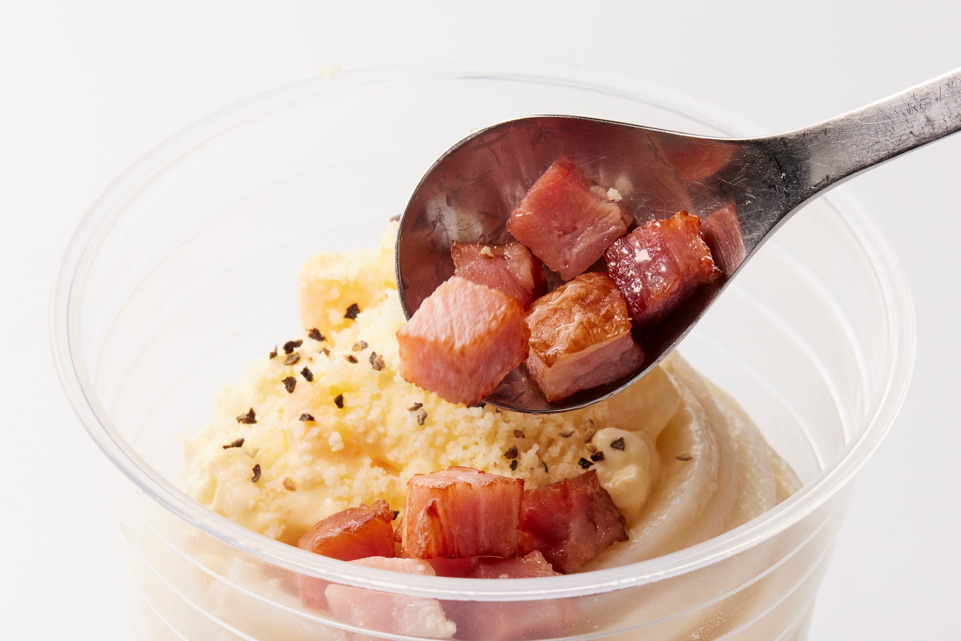 うどんによく絡むよう、玉子サラダは卵と数種類のチーズソースを合わせたなめらかな口当たりに仕上げました。シェイクすると、だしになじんで麺に絡み合いカルボナーラならではのコクのある味わいを楽しんでいただけます。