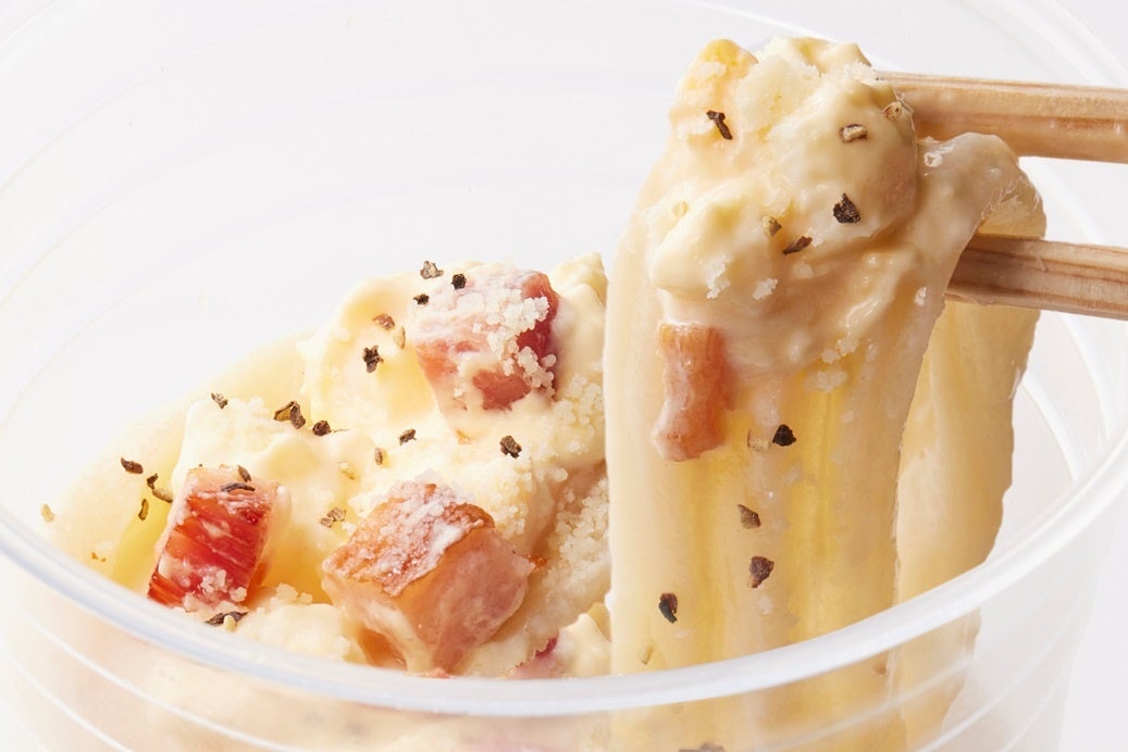シェイクすることで、うどんに濃厚カルボナーラだし、玉子サラダが絡んで簡単にカルボナーラができあがり。香ばしく揚げたベーコンの食感や香りのよいパルメザンとブラックペッパーがアクセントとなり、食欲をかき立てる味わい深い一杯です。