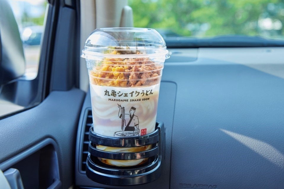 「丸亀シェイクうどん」の容器は、カップ型で片手で持って食事できるため、スペースも取らずにどこでも簡単にお楽しみいただけます。また、車のドリンクホルダーにも収まるので、安心して車での移動中のお食事にもご利用いただけます。