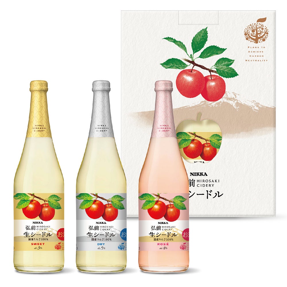 『ニッカ弘前 生シードル りんごラベル』は、リンゴを搾汁した後に発生し、通常は廃棄されるリンゴ粕を表面のラベルと包装箱に使用した商品です。本商品の原材料の調達から廃棄までの過程で排出される1セットあたり5.5㎏のCO2をリンゴ粕のアップサイクルに加え、「幸せの青い森プロジェクト」のクレジットを購入し、カーボン・オフセットすることで、ライフサイクル全体でカーボンニュートラルを実現しました※。リンゴ粕を使用していることを訴求するために「りんごラベル」と名付け、パッケージに「PLANS TO ACHIEVE CARBON NEUTRALITY(カーボンニュートラル達成への計画)」の文字を記載しました。本商品は3種詰合せセットとして販売します。