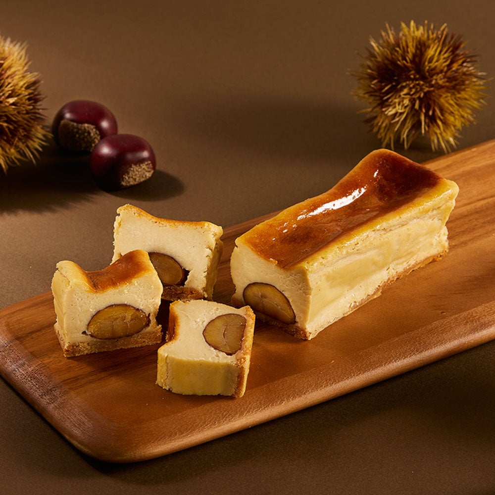 クッキー生地の上にまるごとの栗をぎっしりと並べ、北海道産のクリームチーズ、茨城県産「利平栗」を使用した濃厚なチーズケーキを流し込み、じっくりと焼き上げました。