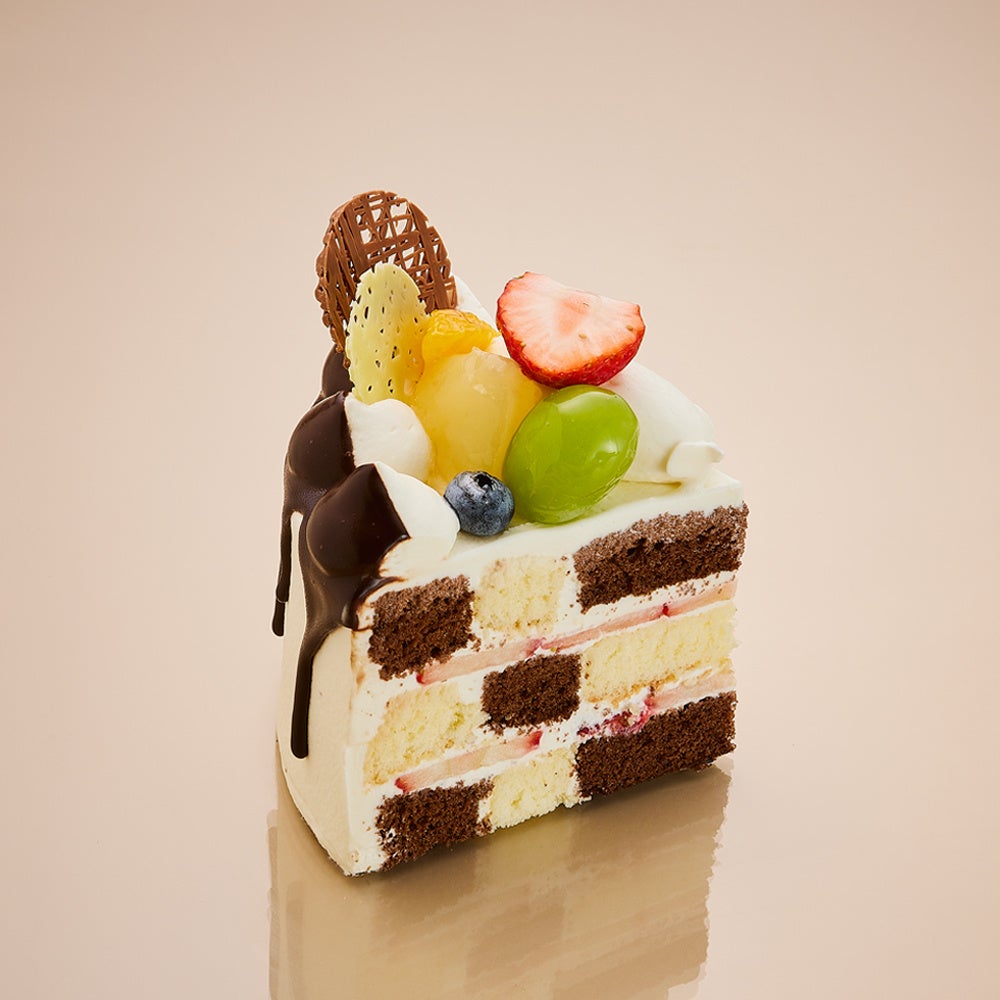 スライスイチゴと生クリームをサンドした2色のスポンジが作るチェック柄もパーティーを楽しく彩ります。