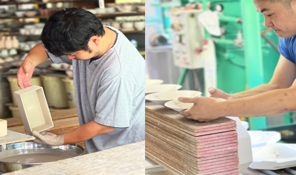 白磁と鉄黒、それぞれを得意な窯元とつくりました。白磁は1670年創業の「瀬貞製陶所」。近年は白磁釉薬を独自ブレンドした現代的な食器も手掛けています。鉄黒は1992年創業の「秀石窯」によるもの。自社で粘土を調合し、耐久性に優れた器を制作。成型技術を自負する窯元です。