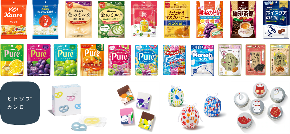当社は1912年の創業以来、社名になっている「カンロ飴」を始め、菓子食品業界で初ののど飴となる「健康のど飴」、ミルクフレーバーキャンディ市場売上No.1ブランド※1「金のミルク」、大人向けグミの先駆けでありグミの売上トップブランド※2である「ピュレグミ」など、生活者の皆さまから愛される商品を創り続け、成長してまいりました。直営店「ヒトツブカンロ」では、「ヒトからヒトへ つながる ヒトツブ」をコンセプトにキャンディの魅力を発信しております。