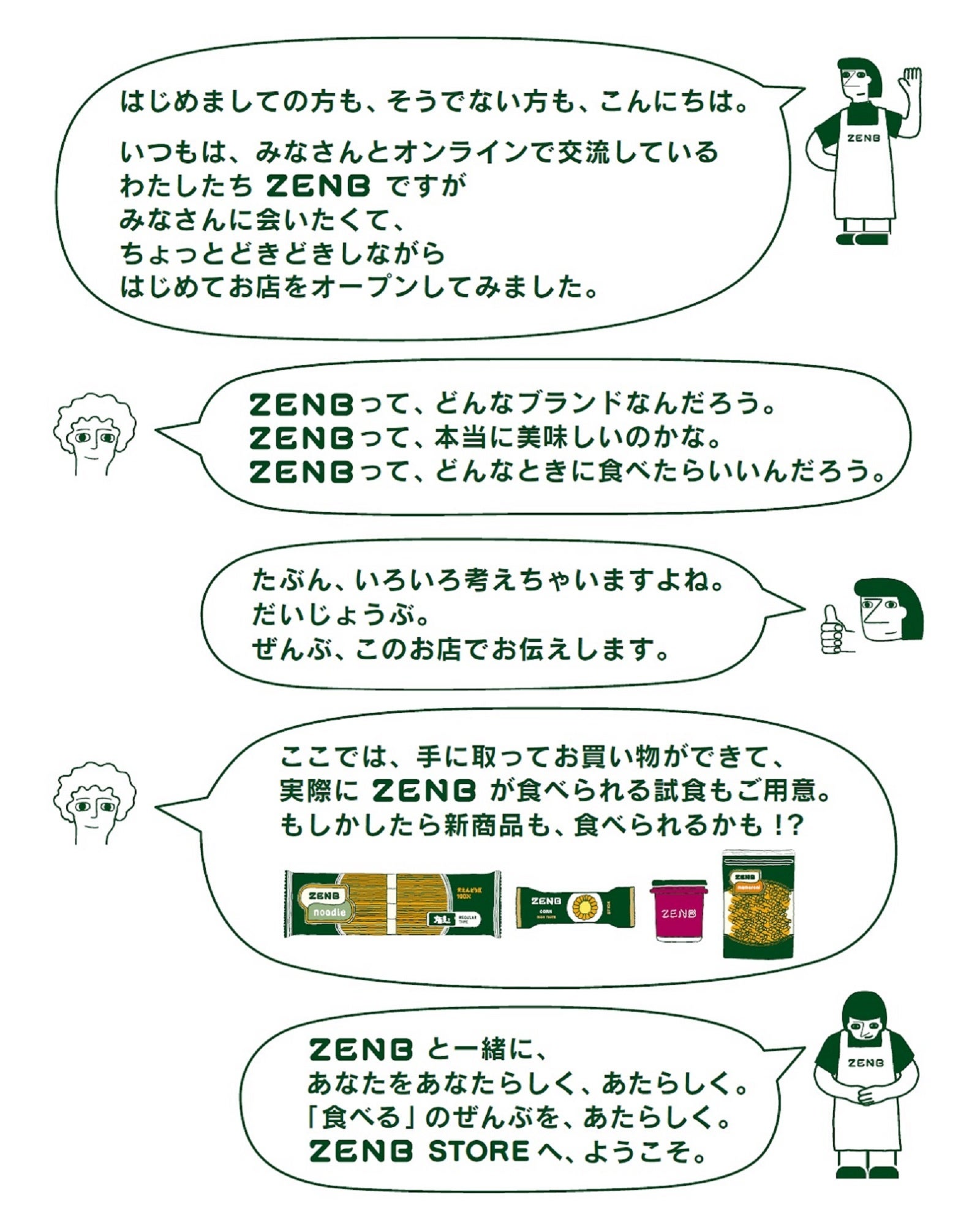 累計販売食数1,300万食を突破した「ZENBヌードル」を始め、オンライン中心に販売するZENB商品の購入や試食体験に加え、ZENBブランドに共感する様々な分野のコラボレーターによるストア限定のスペシャルコンテンツも実施。ここでしか手に入らない手ぬぐい専門店「かまわぬ」とのオリジナルグッズやZENBアイスやZENB弁当などのコラボメニューも販売します。
