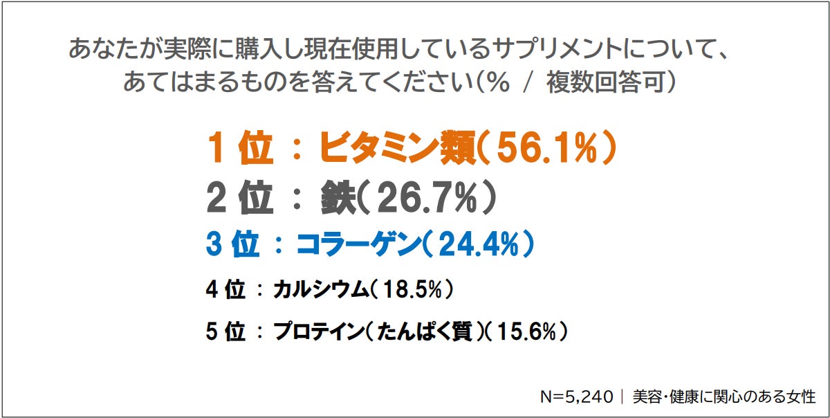 【ネスレヘルスサイエンス コラーゲンに関する実態調査】美容・健康に関心を持つ女性の3割がサプリメントを摂取 上位3位は「ビタミン」、「鉄」、「コラーゲン」