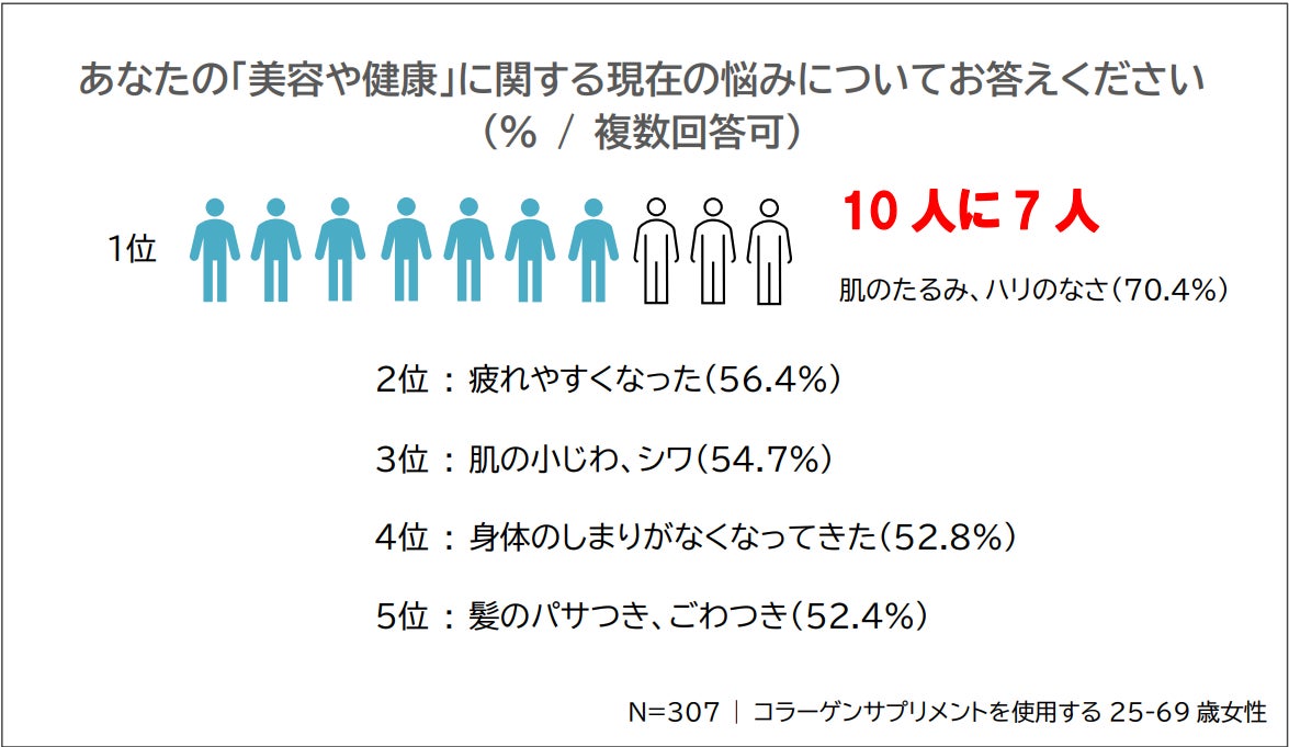 ■コラーゲンサプリ使用者の悩み、7割が「肌のたるみ、ハリのなさ」、5割が「疲れやすさ」