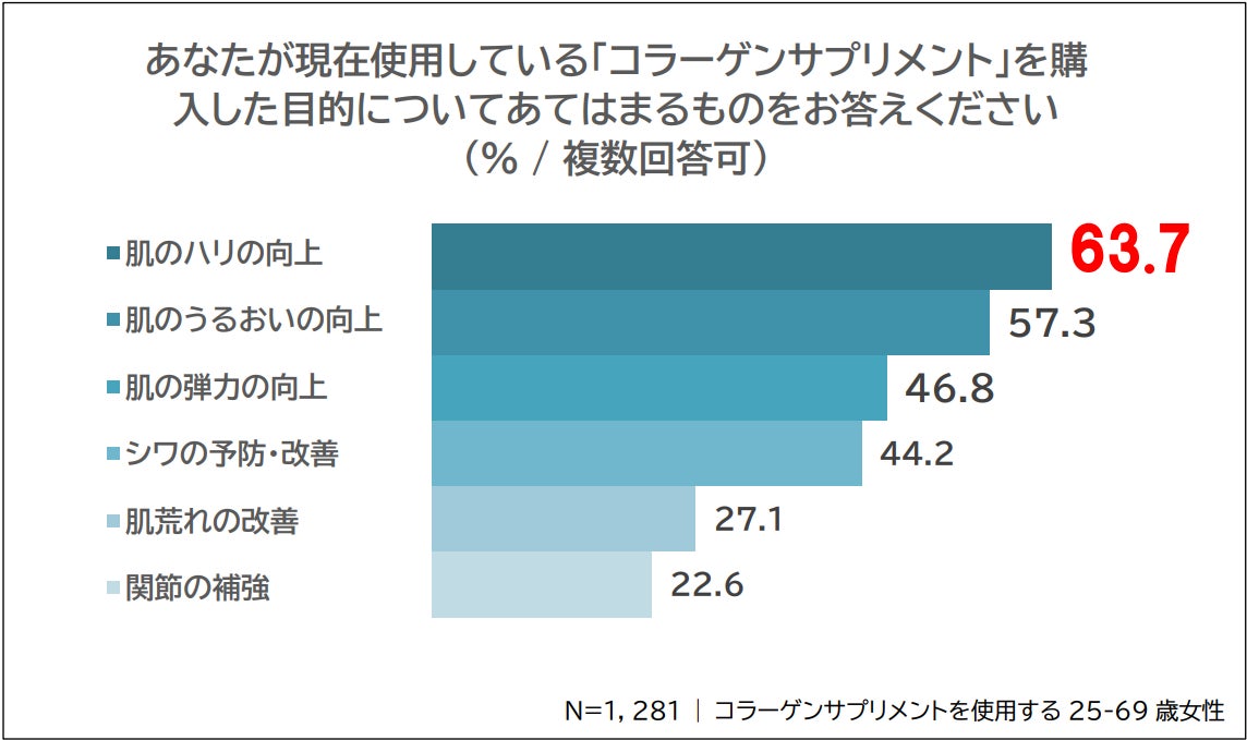 - コラーゲンサプリメント使用者の2人に1人以上が肌の改善を目的として購入している