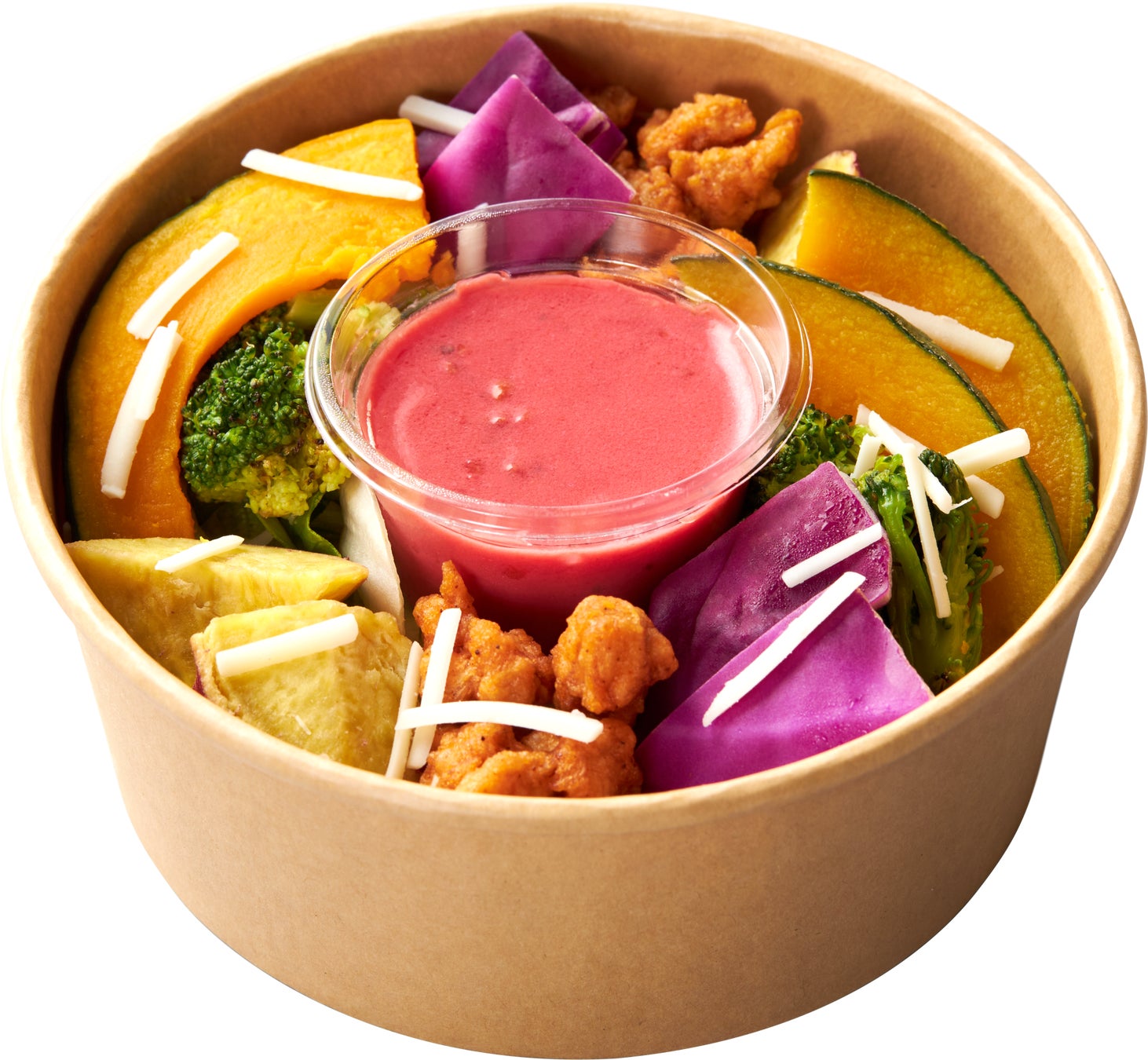 ビーツの素材の色を活かしたピンクカラーが目を引く、スモーキーなナッツドレッシングに、かぼちゃやさつまいも、大豆ミートのフリットなど10品目を合わせました。