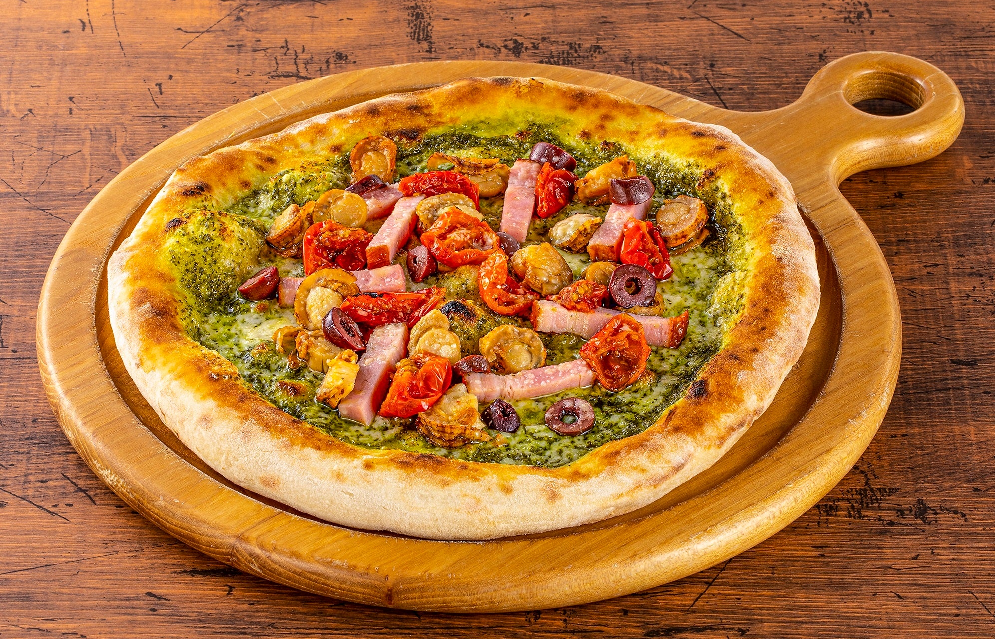 バジルソースに醤油麹でマリネした噴火湾産ベビーホタテ、ホエー豚のベーコン、セミドライチェリートマト、カラマタオリーブをトッピング。 他では食べられないオリジナルピザです。