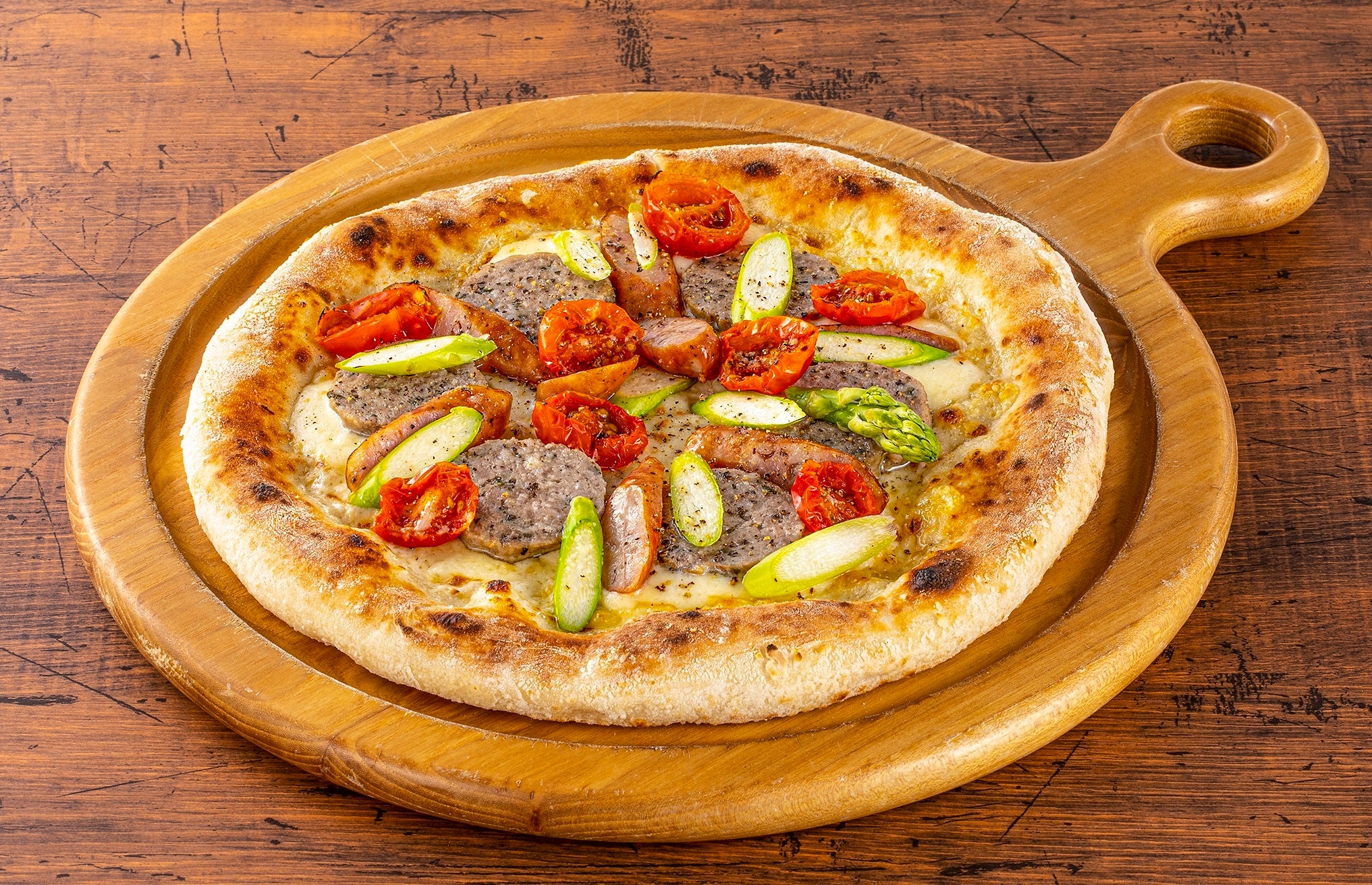 自家製サルシッチャ、ブラックペッパーのスパイスが効いた粗びきソーセージ、アスパラ、セミドライチェリートマトをトッピングしたボリューミーなオリジナルピザです。