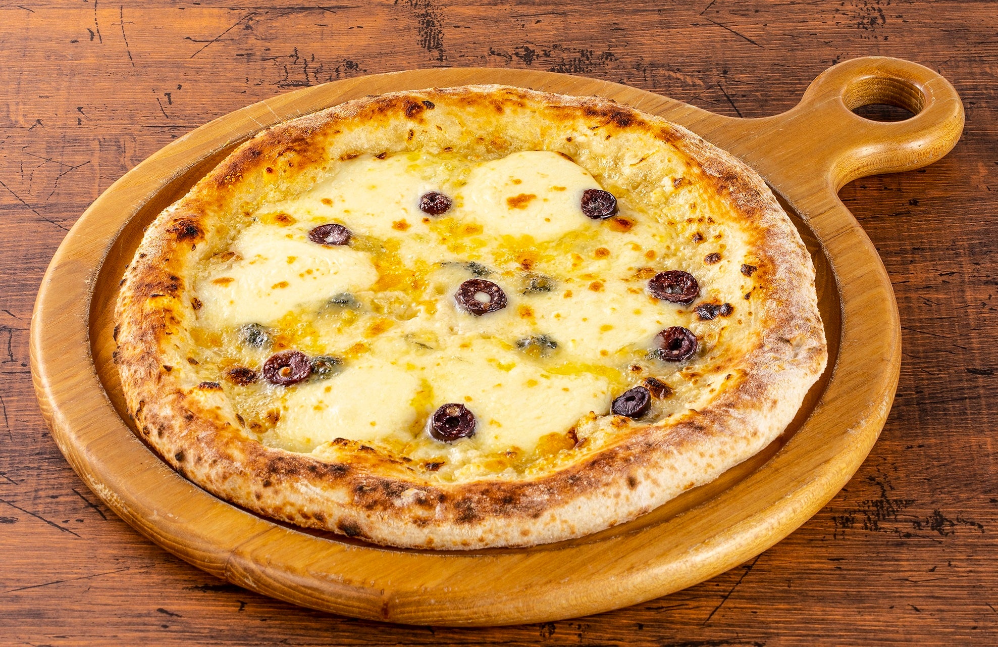チェダー、ゴーダ、パルメザン、モッツァレラ、ゴルゴンゾーラ、グラナパダーノ、マスカルポーネの7種チーズをトッピングしたチーズ好きのためのピザです。