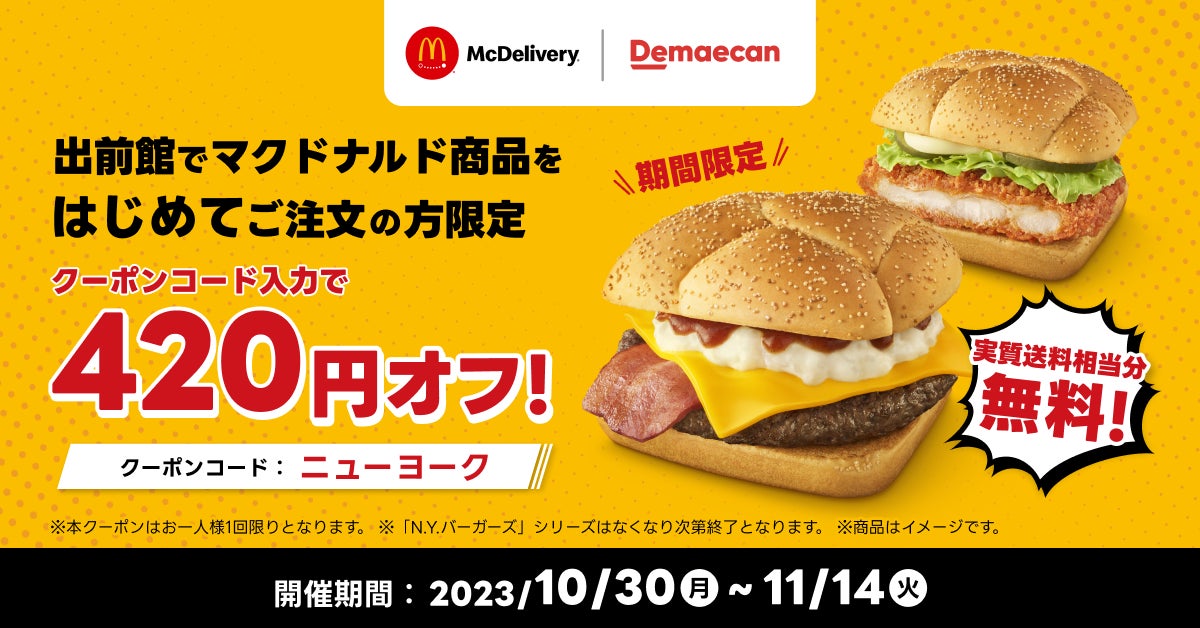『出前館』でマクドナルド商品をはじめてご注文される方限定で、送料相当分の420円がオフになるクーポンをご利用いただけます。期間限定商品の「N.Y.バーガーズ」シリーズも対象となりますので、自宅でもお手軽にニューヨーク気分を味わってみてください!