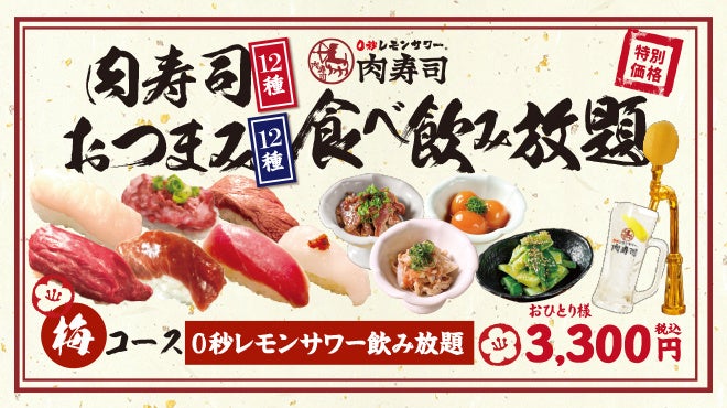 【梅コース】0秒レモンサワー付!肉寿司12種+おつまみ12種食べ飲み放題90分3,300円(税込)