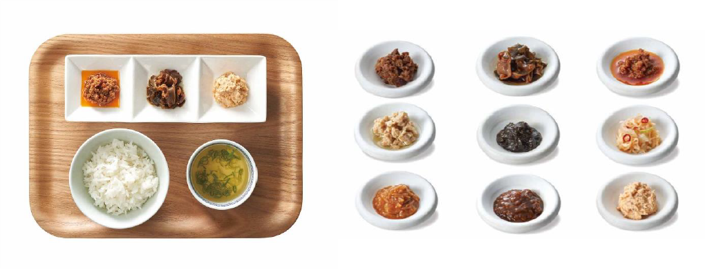 /ご飯1杯とご飯のお供3種類 (スープ付き) 550円 イートイン