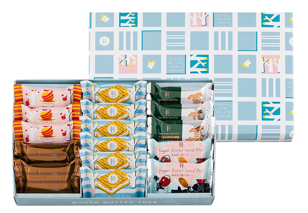 【内 容】シュガーバターサンドの木 (定番味 6個・アップルパイ風 3個・お抹茶ショコラ 3個・あまおう苺バター 2個)、たっぷりショコラサンド 横綱 2個