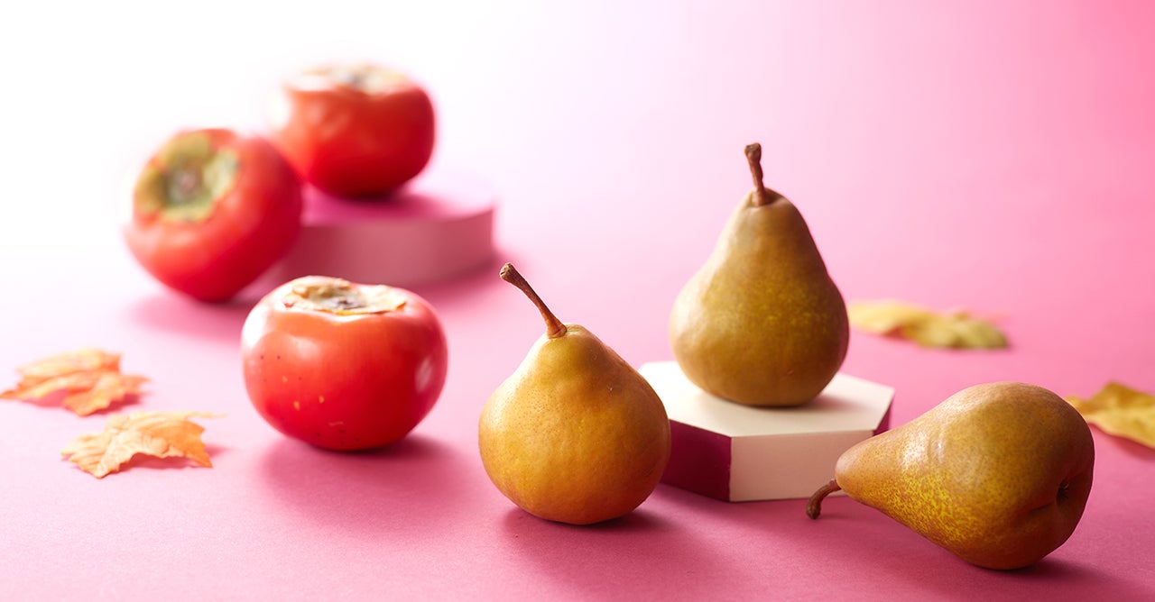 11月のフルーツティアラでは、優しい秋風に運ばれ実った「洋梨」「柿」などの、この時期ならではのフルーツをご用意します。洋梨はなめらかな食感と濃厚な甘みで、クリーム色のきめ細かい果肉。柿は歯触りと上品な甘さが特長です。