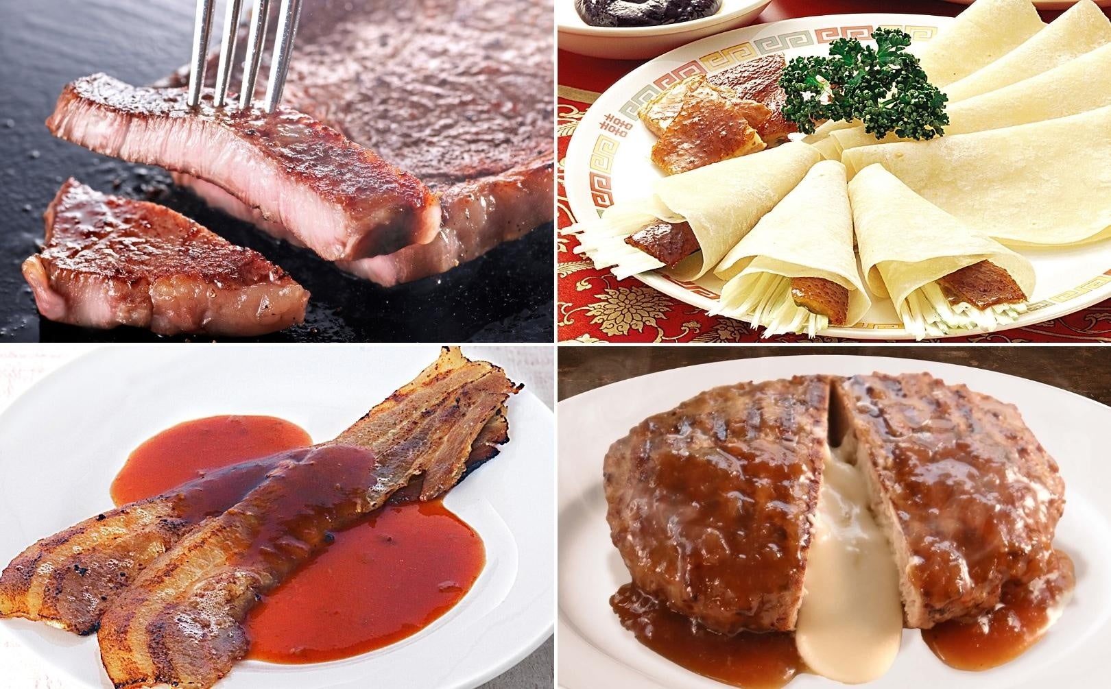 プレミアムコースでは、『ビーフステーキ』や、肉汁と10種類のブレンドした濃厚なチーズが溢れ出す『チーズインハンバーグ』、旨みがきいた濃厚ソースで味わう『ポークグリル バーベキューソース』、肉厚ジューシーな『北京ダック』もご堪能いただけます。