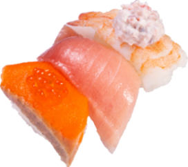 さび抜き寿司が好物な風子をイメージし、かっぱ寿司で人気のネタ3種(サーモン・中とろ・えび)に、いくらとイカサラダをトッピングしました。素材そのものを味わえる一皿です。