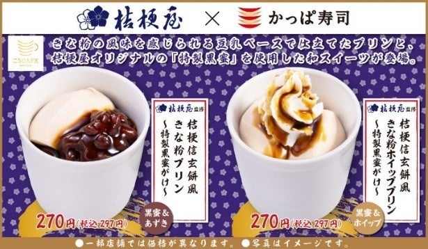 山梨県の老舗和菓子屋「桔梗屋」とコラボレーションした和スイーツは、「桔梗屋」オリジナルのきな粉を使用し豆乳ベースで仕立てた、滑らかな口当たりと弾力のある食感が楽しめるプリンです。北海道産小豆を使用した、程よい甘みのゆであずきと、「桔梗屋」特製のとろみある黒蜜をトッピングしました。きな粉の豊かな風味と濃厚でコクのある黒蜜の味わいが楽しめます。
