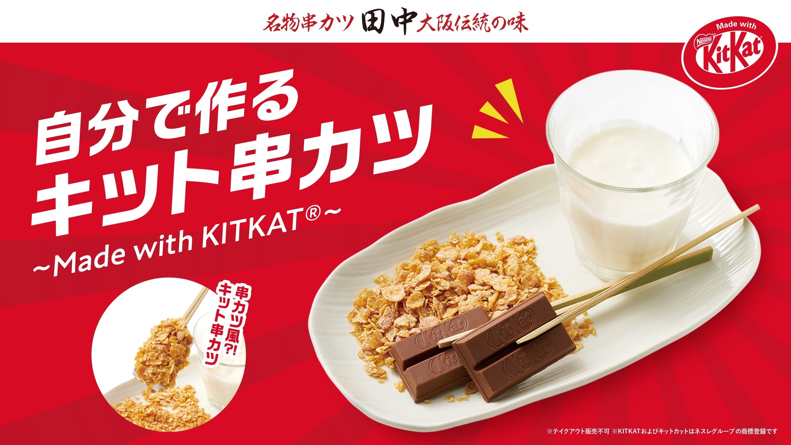 期間中は「キットカット」を揚げた「キット串カツ~Made with KITKAT®~」をはじめとしたコラボ商品や、ノベルティが当たるSNSキャンペーンなど様々な施策をおこないます。