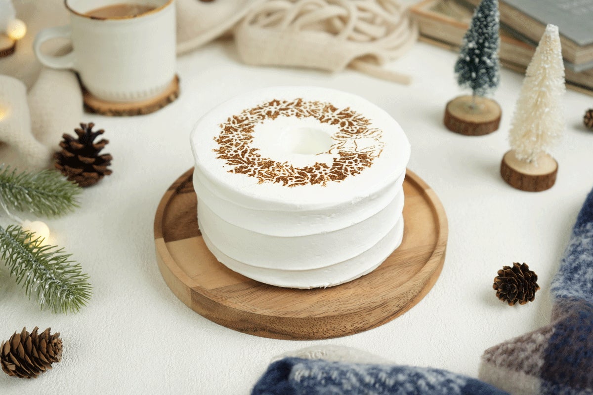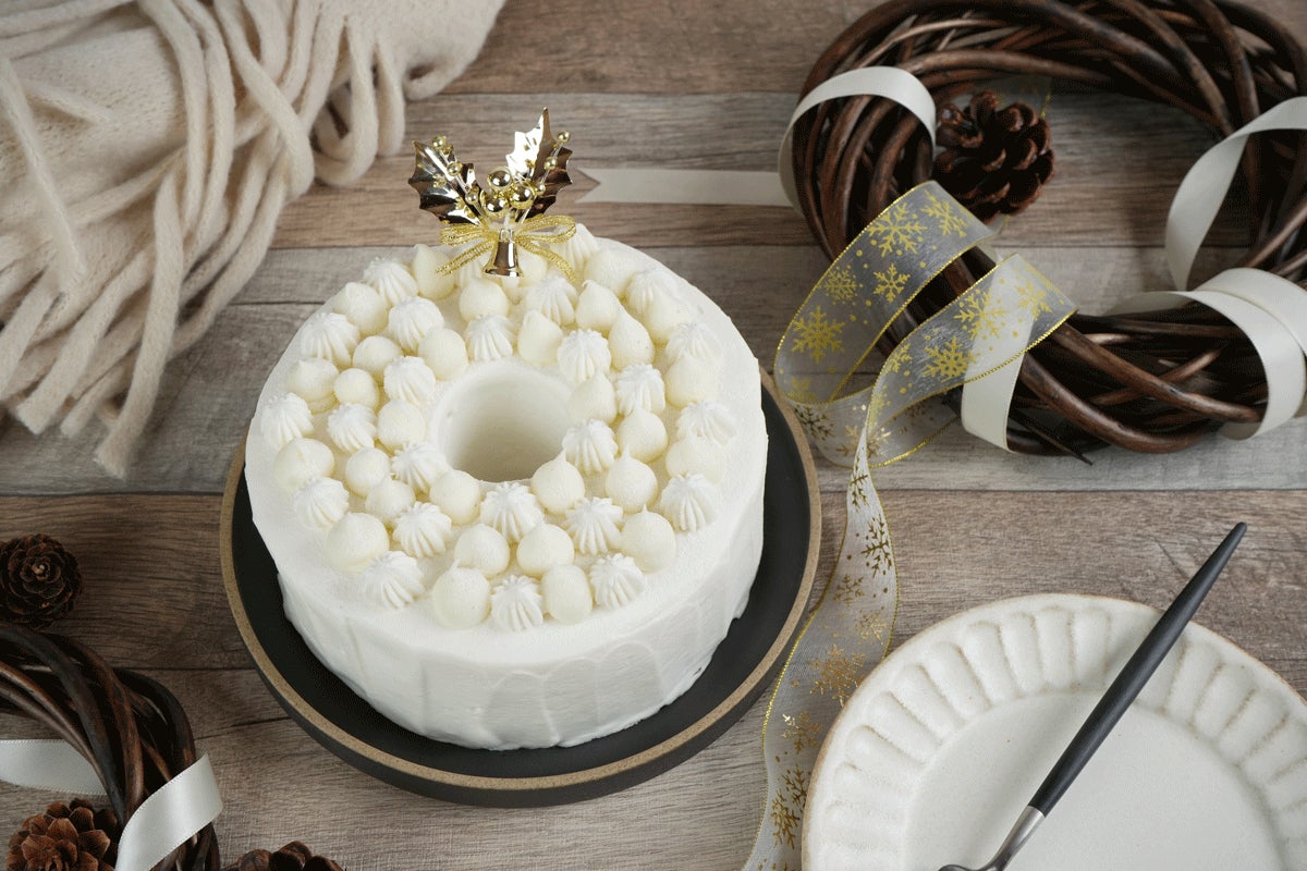 クリスマスリースをモチーフをモチーフとした、純白のシフォンケーキ。