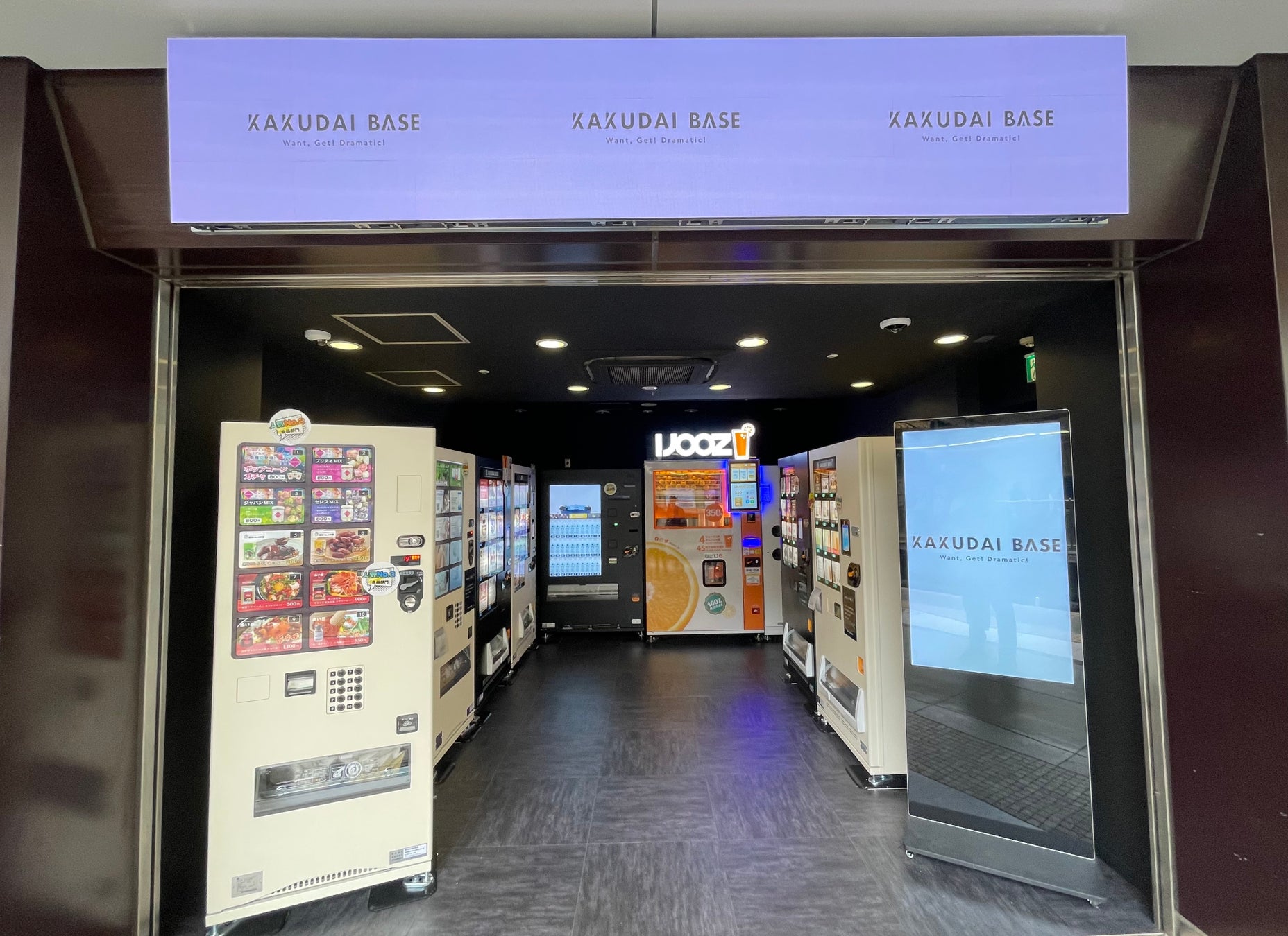 「KAKUDAI BASE」は自販機を複数台集めジャンルを超えたさまざまな商品が購入できる刺激的な空間店舗です。新しい発見からその場で瞬時に購入ができ、ちょっとした非日常体験とワクワク刺激を味わえるマーケットです。偶然に自販機の前に立ち止まったことで、今まで知らなかった素晴らしい商品と出会えた。あの商品が自販機で買えるという衝撃の驚き体験があった。今までに無い、自販機で購入できる新しい体験を味わって頂くことが出来ます。