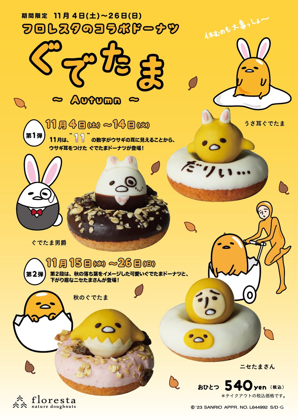 自然な素材にこだわるドーナツ専門店「フロレスタ」に、株式会社サンリオのキャラクター「ぐでたま」とのコラボドーナツが秋仕様で登場です。
