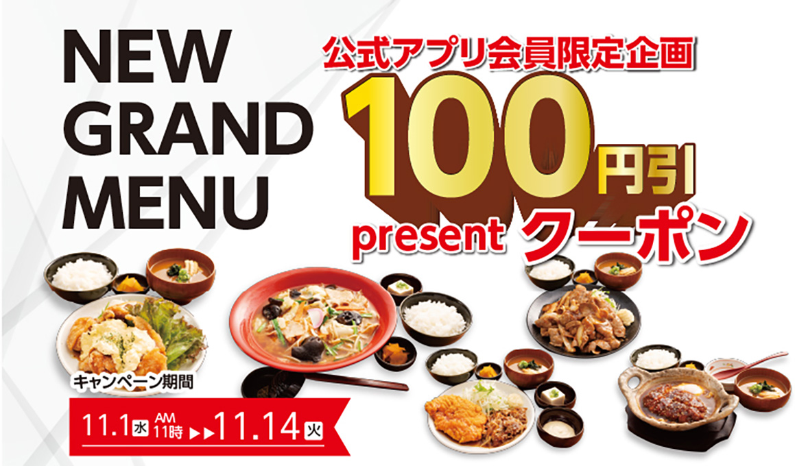 グランドメニューリニューアル記念としまして、期間中何度でも使える新商品5品が100円引きクーポンを宮本むなし公式アプリで配信しますので、この機会にぜひお得にお召し上がりください。