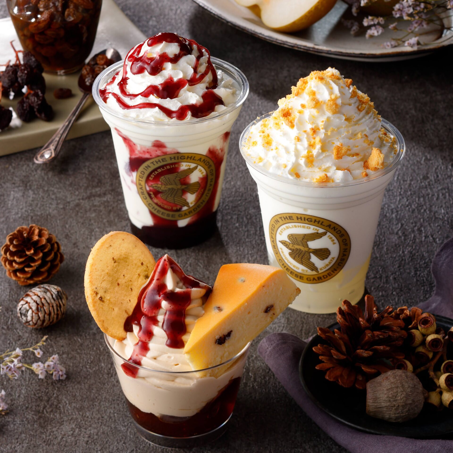 レアチーズケーキの風味が楽しめることで人気のフローズン仕立てのフロマージュドリンクに、レーズンとラム酒のフレーバーを使用した甘美な香りひろがるラムレーズンソースを合わせました。ラムレーズンソースに加え、ブルーベリーソースも使用することでベリーのほのかな酸味がプラスされ、程よい甘さがお楽しみいただけます。また、混ぜ合わせて飲むことで味わいの変化もお楽しみいただけるデザートドリンクです。