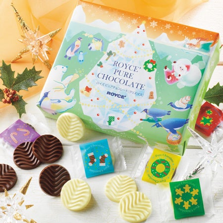 定番人気のピュアチョコレート[ミルク]と[クリーミーホワイト]がクリスマスデザインの限定パッケージで登場。氷のクリスマスツリーを飾りつけるサンタや海の動物たちを描いています。