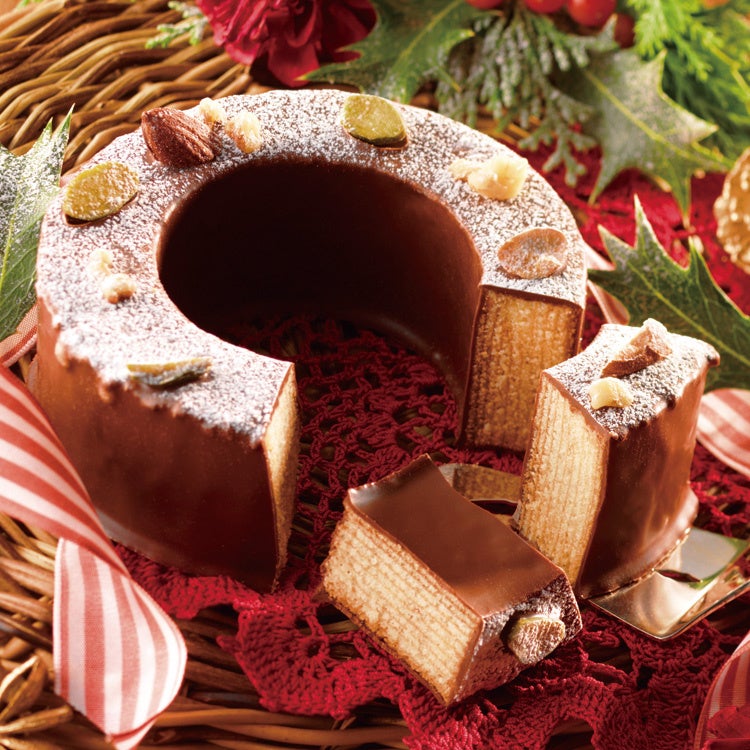クリスマスリースをイメージして粉糖と3種のナッツをトッピングしたバウムクーヘン。はちみつやスパイス、メープルシロップ、マジパンローマッセを生地に加え、しっとりとしたコクのある味わいに仕上げました。表面にコーティングしたすっきりとした甘さのチョコレートが、生地の豊かな味わいを引き立てます。食べやすいミニサイズです。