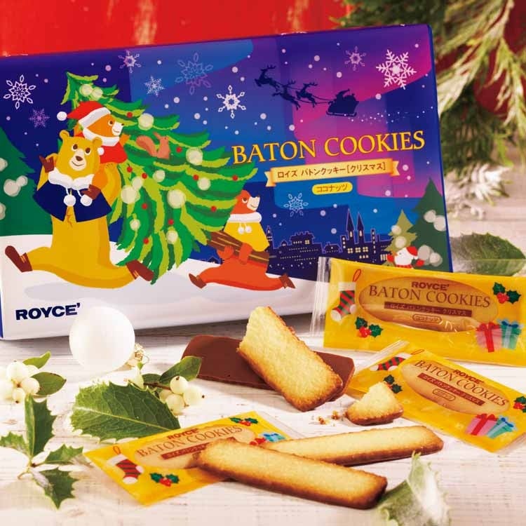 ココナッツが香るさくさくとした食感のクッキーの片面にチョコレートをコーティングした人気商品、バトンクッキー[ココナッツ]を、クリスマスを心待ちにするくまの親子を描いた限定パッケージでご用意しました。