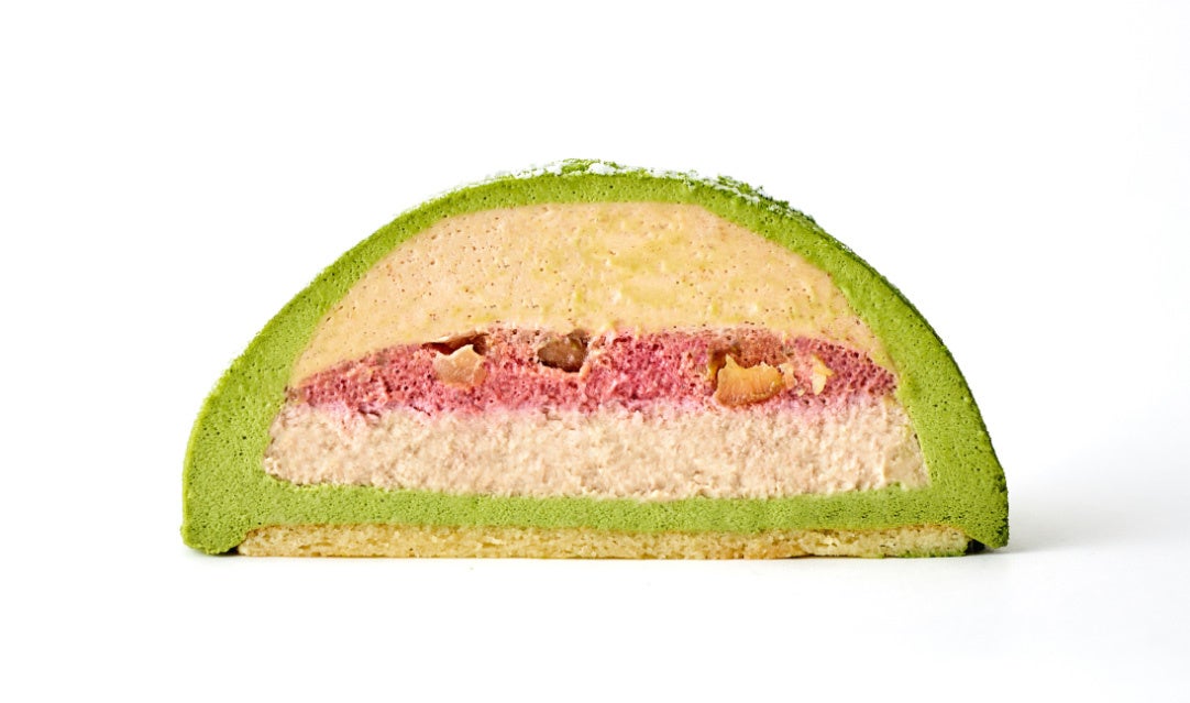きれいなグリーンが目を引く、クリスマスケーキです。低温でゆっくりと焼き上げたマロンのチーズケーキと、クレームカシス、マロンをふんだんに使用し、抹茶のムースで包んでいます。抹茶のほろ苦さの中に、マロンの風味、そして甘酸っぱいカシスがアクセントになっていて、和と洋が絶妙に重なり合う逸品です。