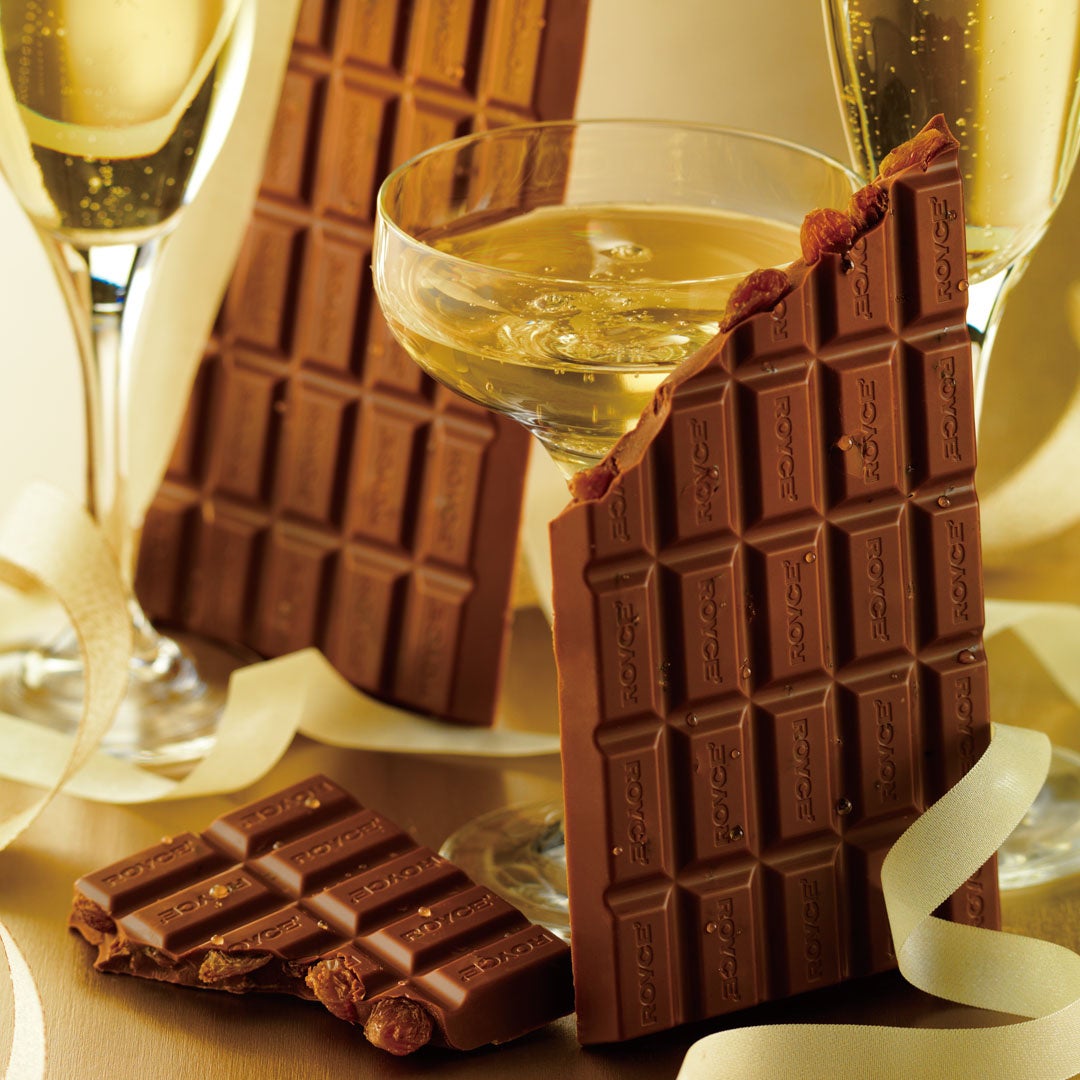 シャンパン ピエール ミニョンとブランデーに漬け込んだレーズンをまるごと、まろやかなミルクチョコレートに散りばめました。