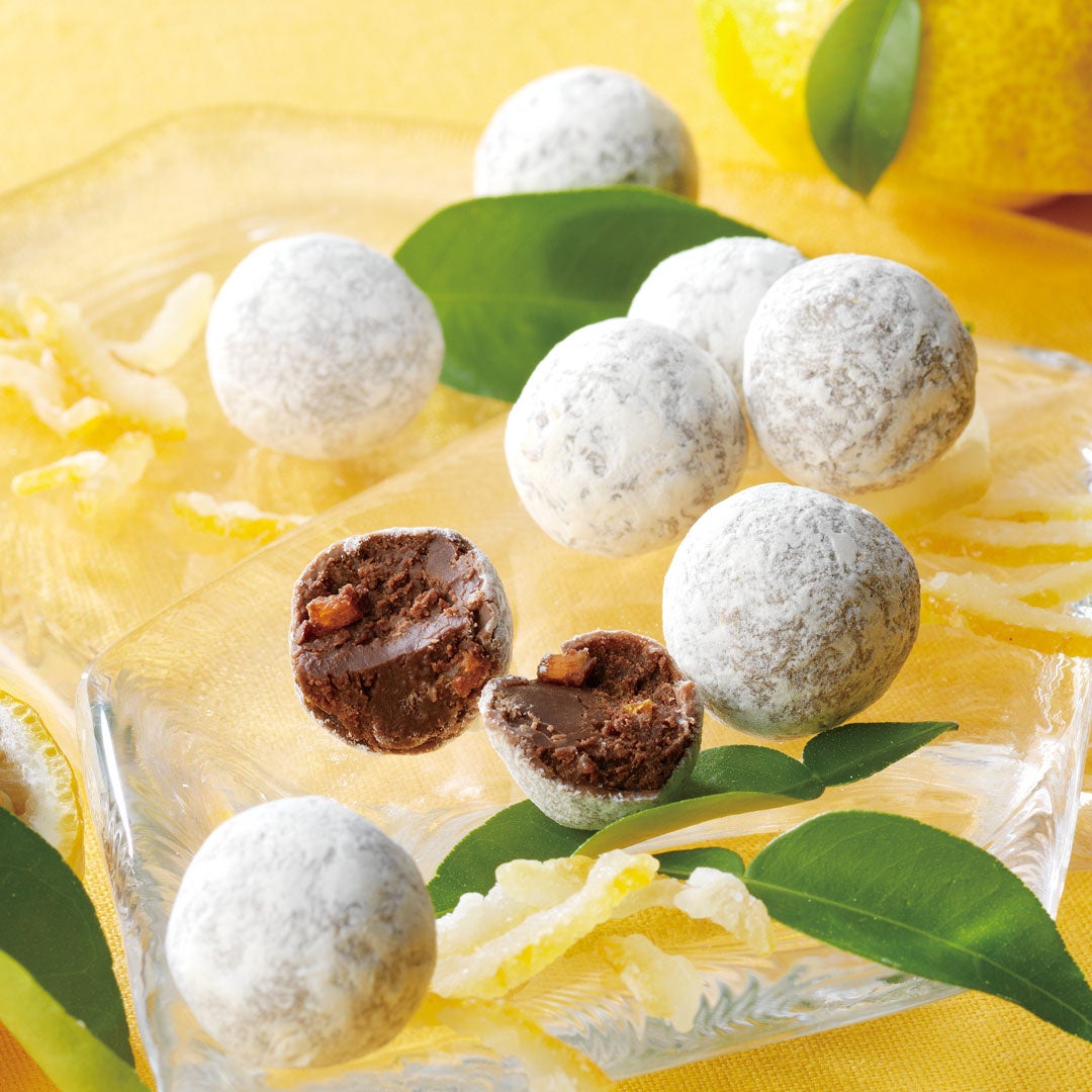 ゆず酒と愛媛県産のゆずピールを加えたガナッシュに、シュガーパウダーとゆずパウダーをまぶしました。ゆずならではのさわやかな香りやほのかな苦みを、すっきりとした味わいのチョコレートが引き立てます。