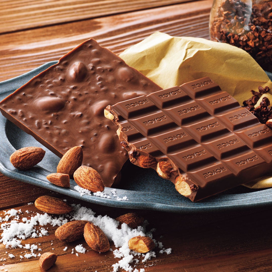 塩がけしたアーモンドとキャンディング(飴がけ)したカカオニブを、ミルクチョコレートに散りばめました。アーモンドの風味とともに広がる程よい塩味が、まろやかなミルクチョコレートとベストバランス。カカオニブのほろ苦さが、すっきりとした後味のアクセントになっています。