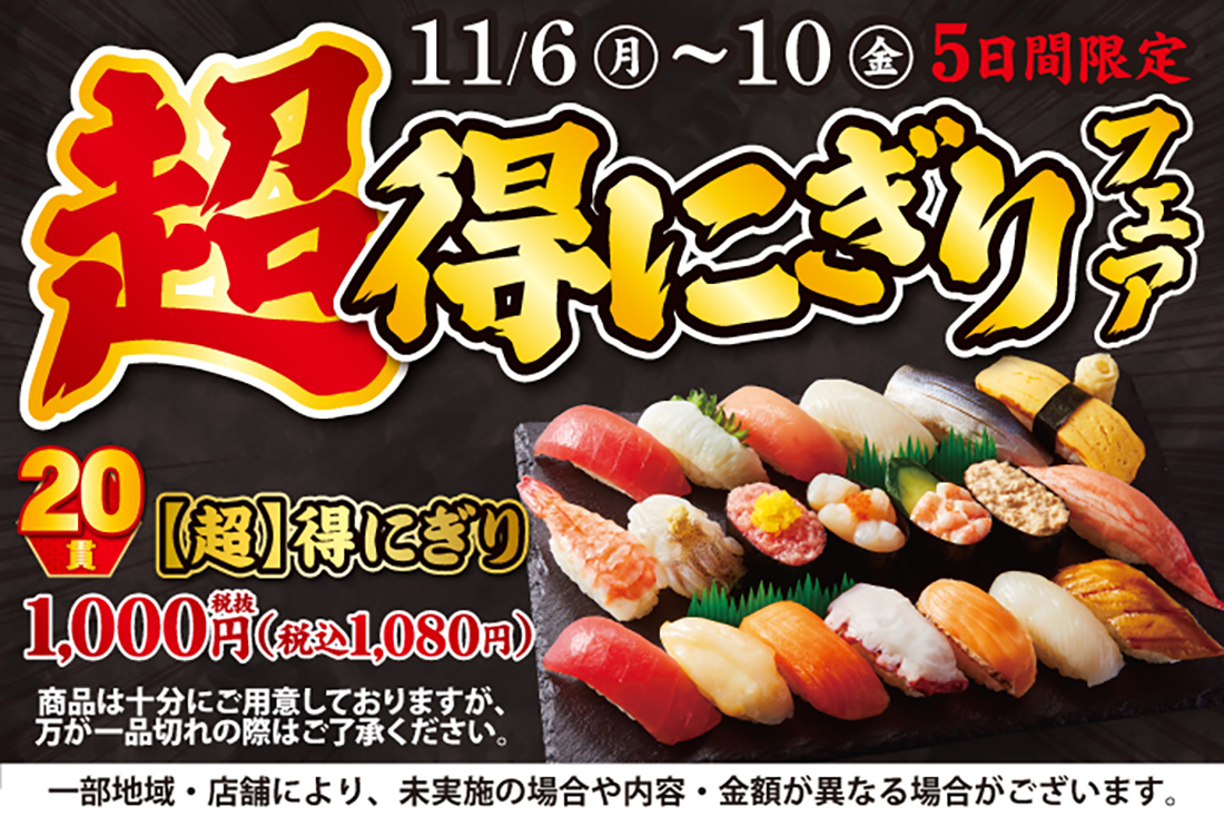 大人気企画が再登場!小僧寿しでは、日頃のご愛顧に感謝を込めまして…11/6(月)~平日5日間限定!『【超】得にぎりフェア』開催!