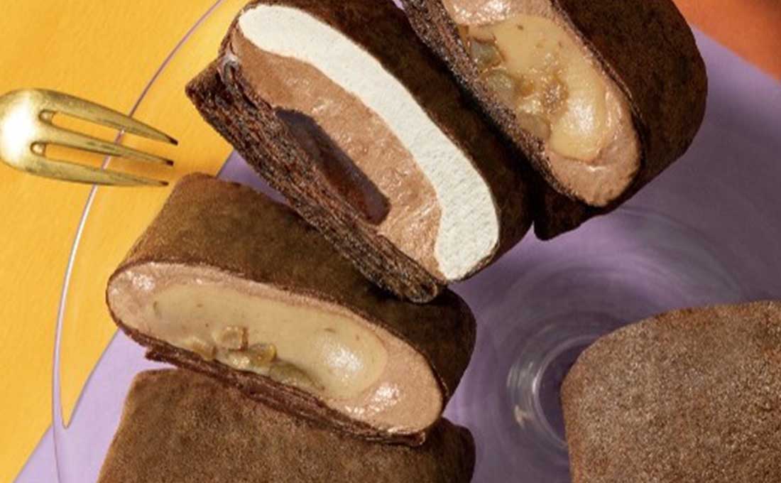 どちらのフレーバーも、もっちり食感のカカオクレープ生地で包みました。
