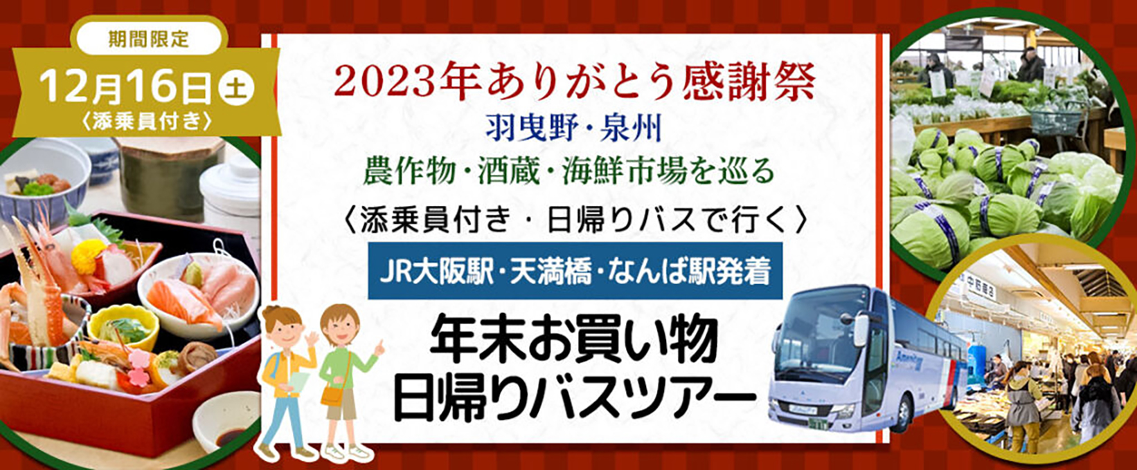 12月16日(土)おひとり様6,800円【羽曳野・泉州】〈大阪駅・天満橋・なんば発着・添乗員付き〉美味しい昼食&ワインナリー・農作物・酒蔵・漁協直営魚屋を巡る 2023年ありがとう感謝祭・お買い物ツアー日帰りバスツアーのオンライン販売を開始しました。