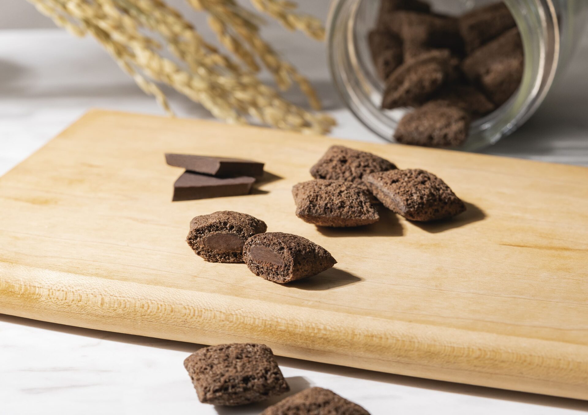小麦・とうもろこし・ライ麦・オーツ麦・米をブレンドし、2種類のココアパウダーを合わせた軽い食感のパフ生地で、ベルギー産チョコレートを包みました。ほんのり塩味、食べ始めると止まらない美味しさです。