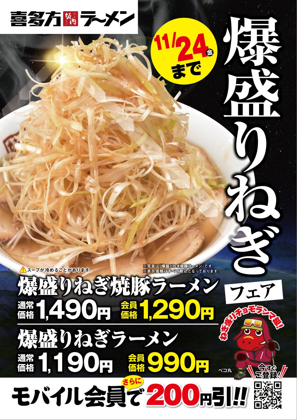 ・公式SNS「爆盛りねぎラーメンフェア」投稿画面もしくはモバイル倶楽部クーポン画面を提示してご注文ください。