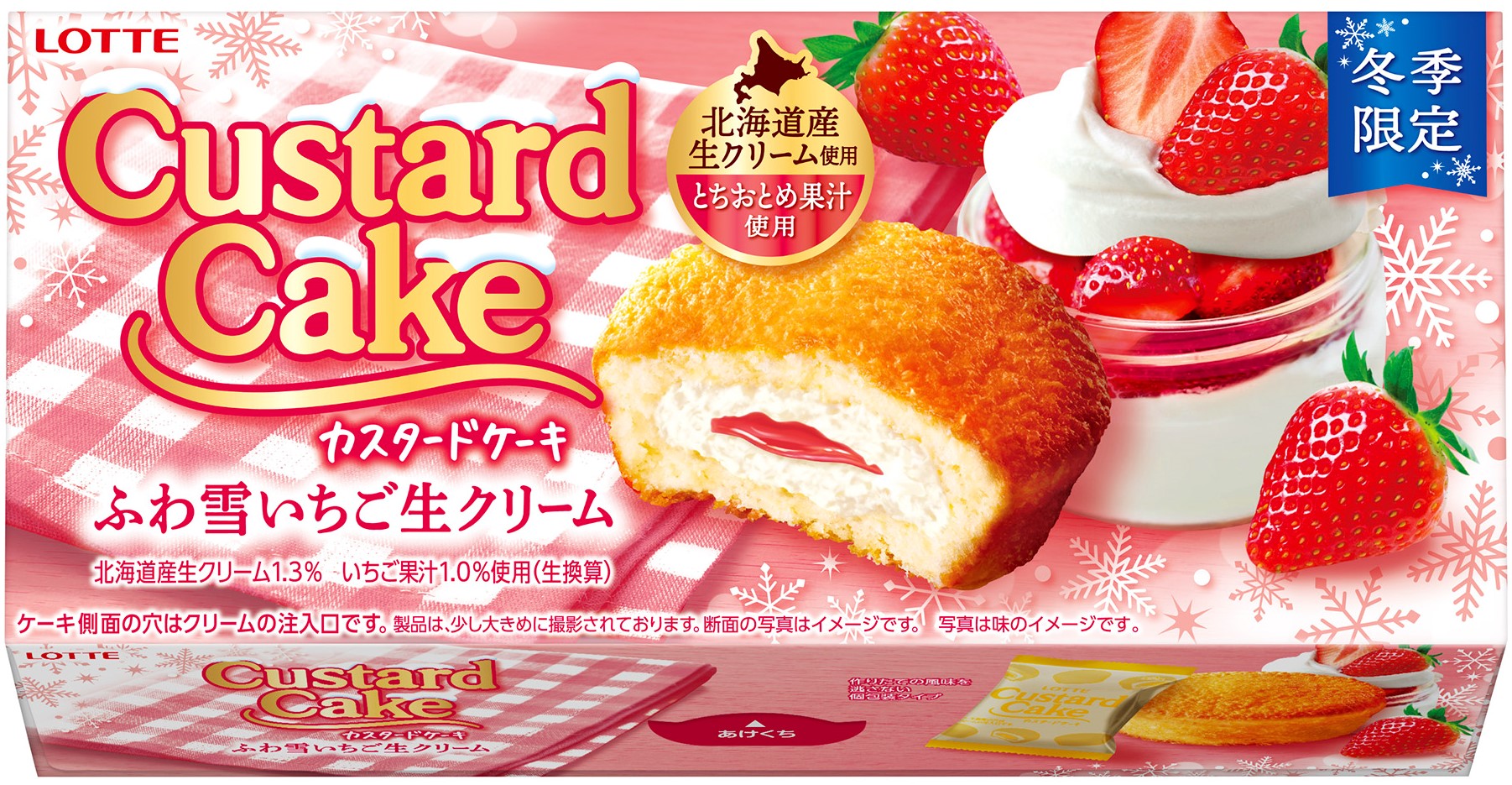 「カスタードケーキ<ふわ雪いちご生クリーム>」は、ふんわり軽い食感の生クリーム入りケーキの中に、生クリーム入りカスタードクリームといちごソースを閉じこめた、冬にしか味わえないカスタードケーキです。