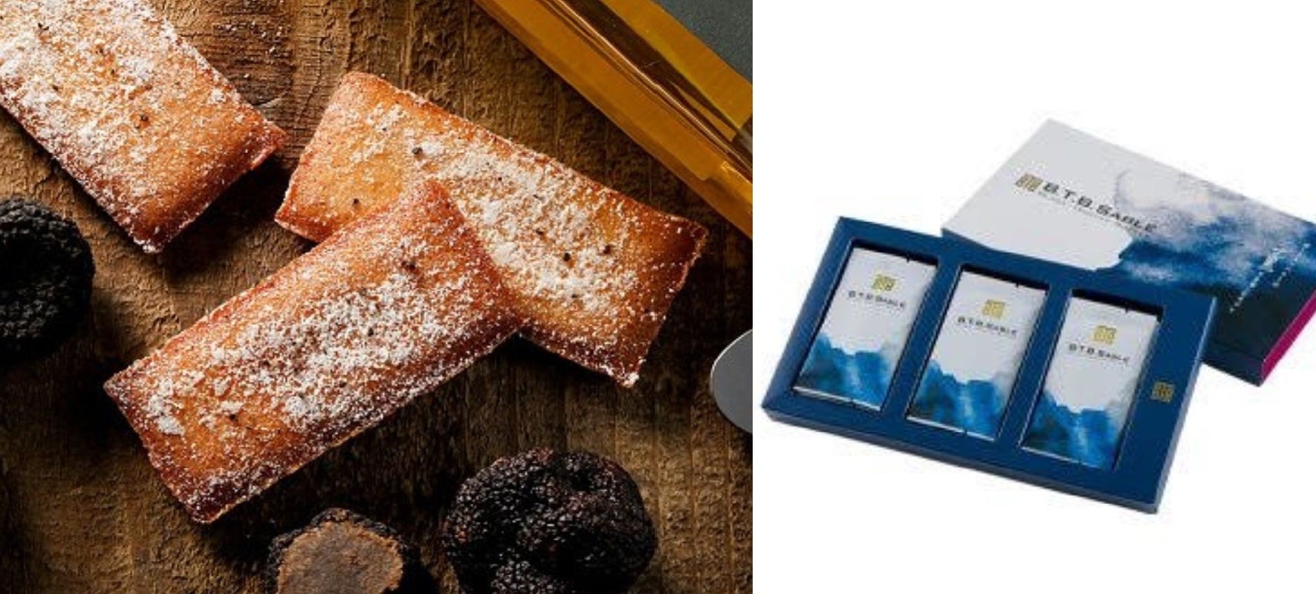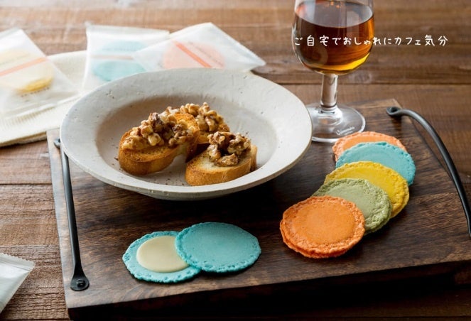 ベースになるサブレ生地には国産バターとトリュフオイル、ブイヨンを加えてカリカリ食感に焼き上げ、最後に黒トリュフをブレンドしたオリジナルシーズニングパウダーで表面を仕上げたサブレ。口に入れた瞬間広がるトリュフの香りは、お酒との相性もよく、チーズやコンビーフ、オリーブなどをのせて、オードブルにしても美味しい一品です。